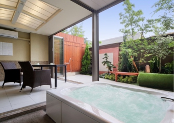 愛犬も楽しめるプライベートガーデンや、お庭と室内を繋ぐ半屋外の空間でケージの代わりなど様々に活用いただける”Dogサバトリ―”、客室露天エアブローバスを備えた贅沢空間です。